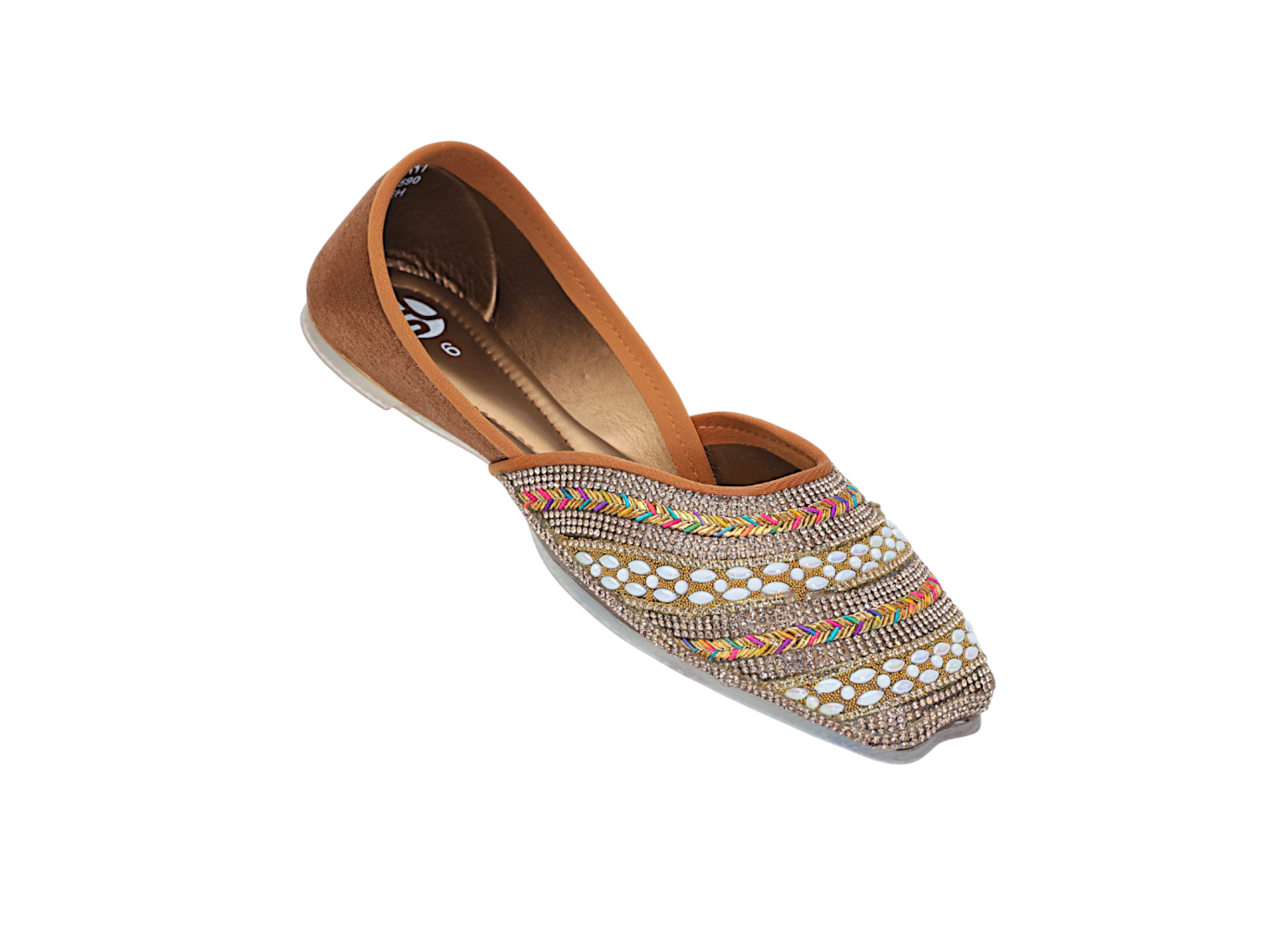 Model no - 386274 Mrp - 590/- Size - 4 - 9 Ladies Flat Mojari Shoe Upper material - Synthetic Sole - Pvc The Ladies Flat Mojari Shoe 386117 is designed for maximum comfort and support. Its ergonomic design features a lightweight, breathable mesh upper and an orthopedic footbed for cushioning, while a padded ankle collar ensures a secure fit. The shoe also boasts a rubber sole for traction. Enjoy all-day comfort with the Ladies Flat Mojari Shoe!